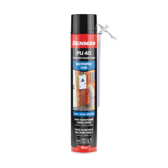 Αφρός πολυουρεθάνης χειρός γενικής χρήσης, από την εταιρεία Benman. Είναι ιδανικός για γέμισμα, στεγανοποίηση και μόνωση σε καθημερινές οικοδομικές και τεχνικές εφαρμογές. Προσφέρει υψηλή διογκωτική ικανότητα και ισχυρή πρόσφυση σε υλικά όπως τούβλα, σκυρόδεμα, σοβά, ξύλο, μέταλλα, φελιζόλ, σκληρό PVC και άκαμπτο PUR.