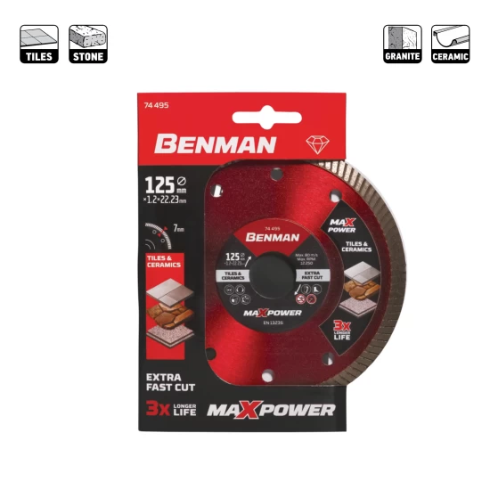 Διαμαντόδισκος πλακιδίων (125 x 1,2 x 22,23 mm), από την εταιρεία Benman, κατάλληλος για γρήγορες, καθαρές και ασφαλείς κοπές σε πλακάκια, κεραμικά υλικά, γρανίτη και πέτρα.